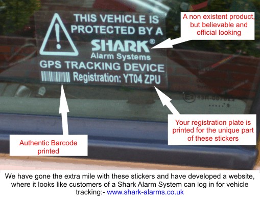 These stickers are produced as a deterrent to thieves, with a non-existent product printed